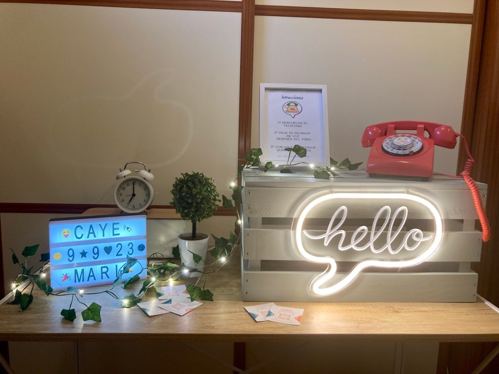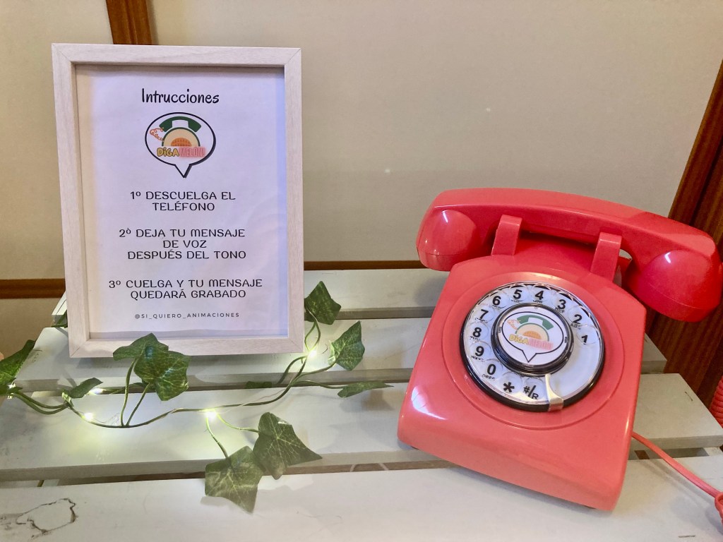 El Digamelón consiste en un pequeño espacio decorado donde los invitados podrán grabar un mensaje de voz para los novios como si estuvieran hablando por un antiguo teléfono y cual confesionario se tratará.
